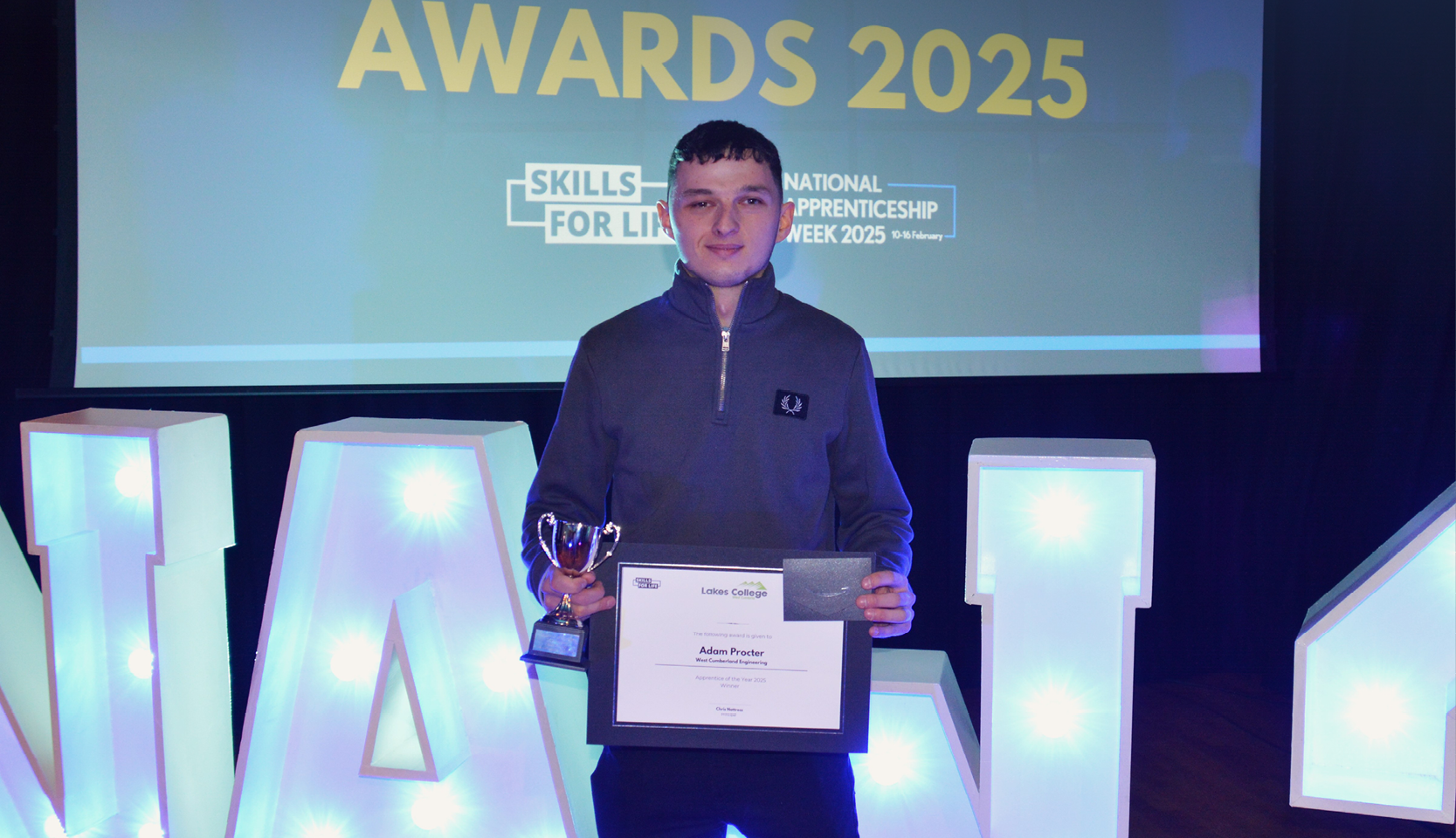 Adam Procter won the Lakes College Apprentice of the Year award on Friday, providing a great ending to National Apprenticeship Week. The award is recognition of Adam’s hard work, commitment, and outstanding dedication throughout his apprenticeship journey.